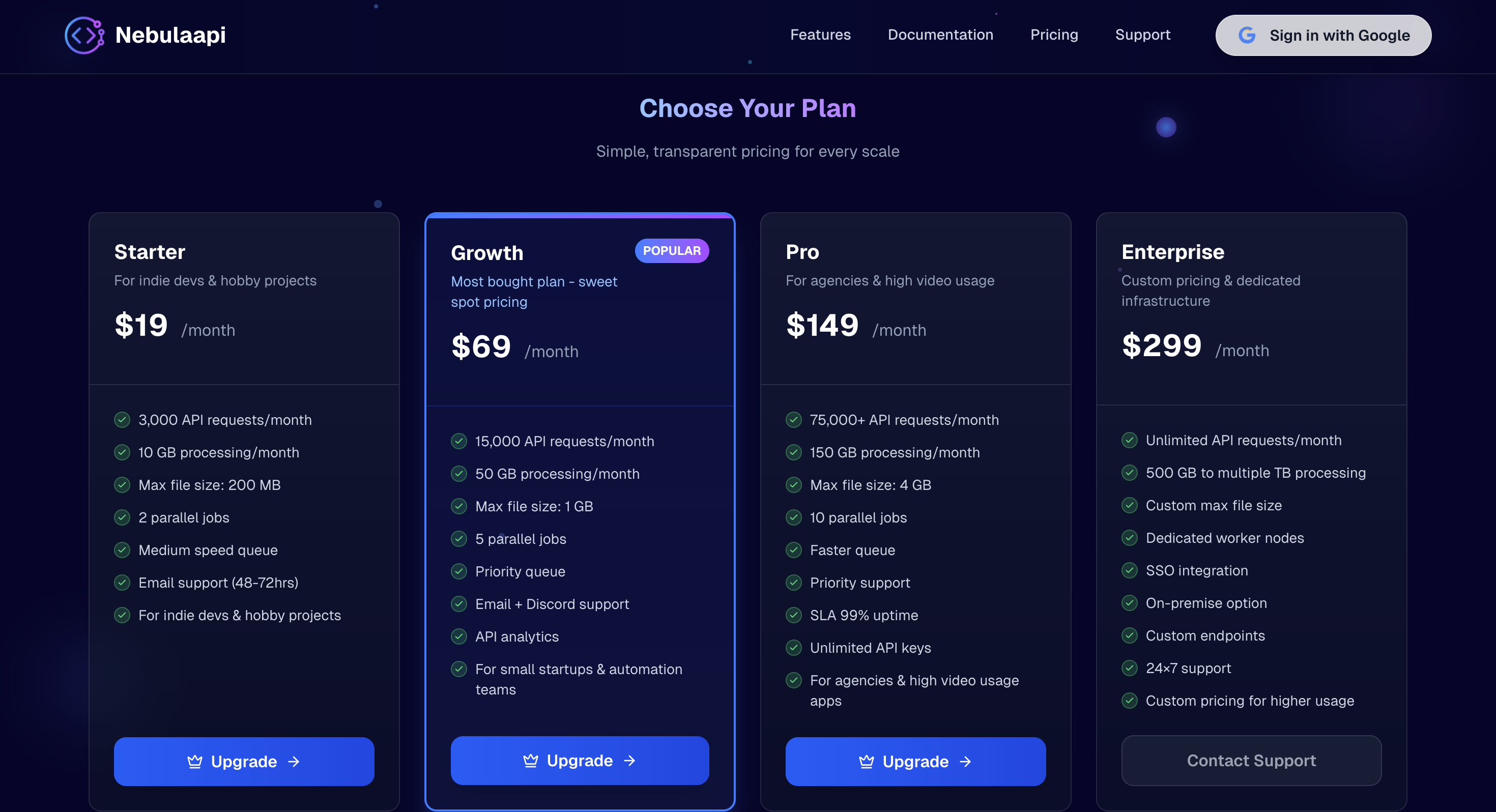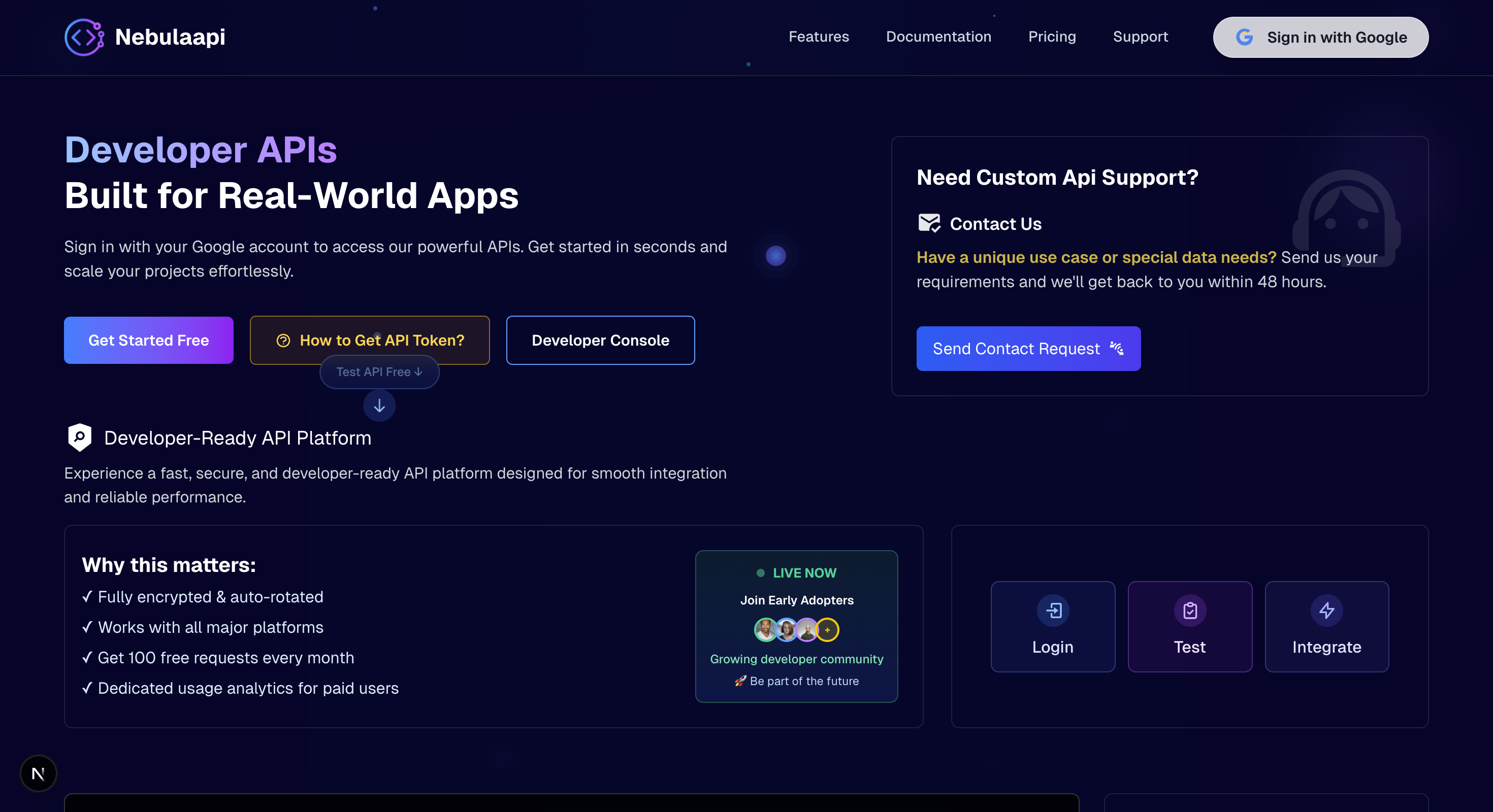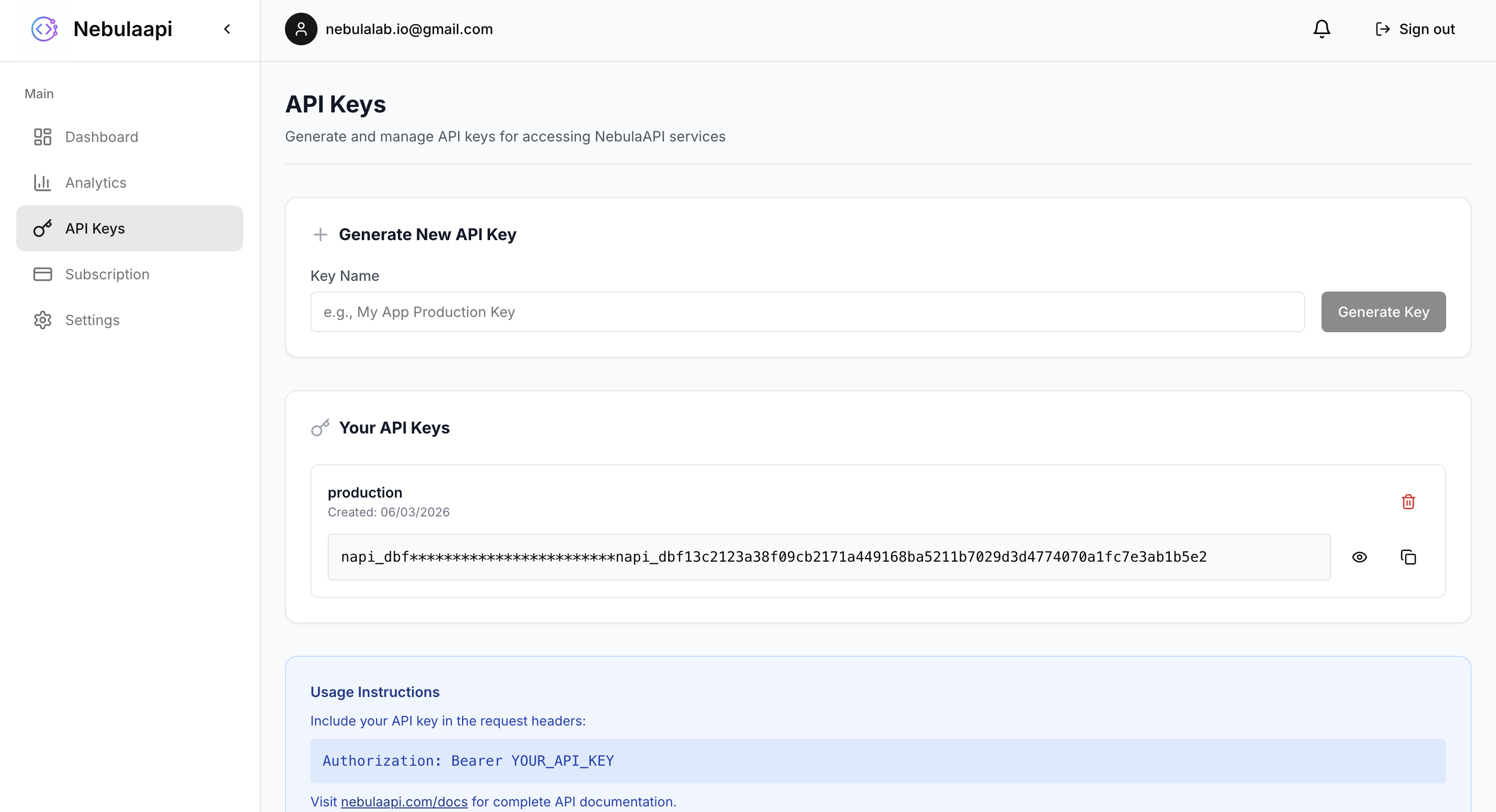 Start by signing in to your NebulaAPI account using your Google account. Click the "Get Started Free" button on the homepage to authenticate.
