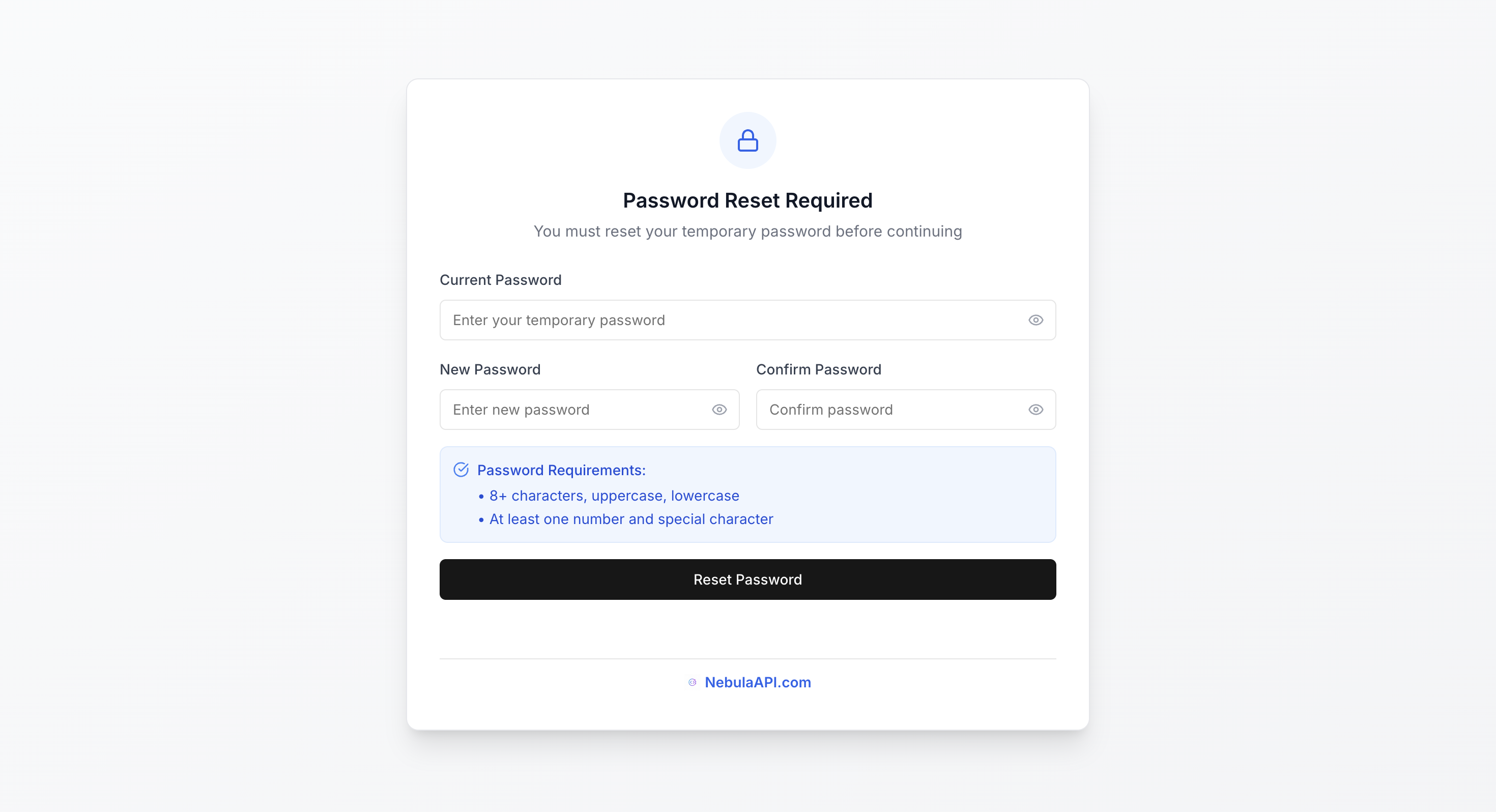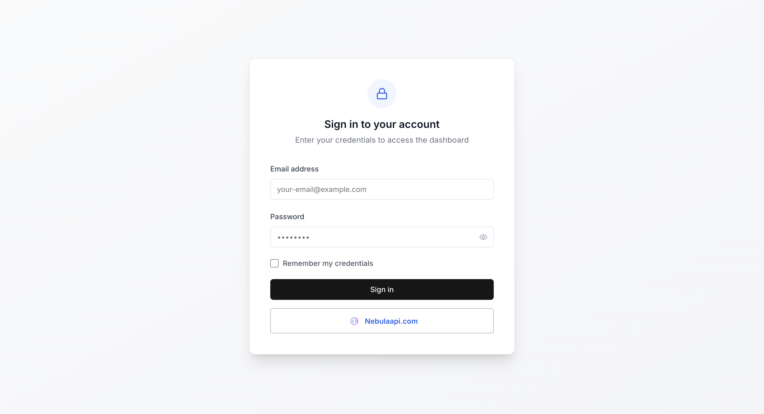 Use the email and temporary password from your inbox to sign in to the NebulaAPI console for the first time. You'll be required to set a new password immediately.